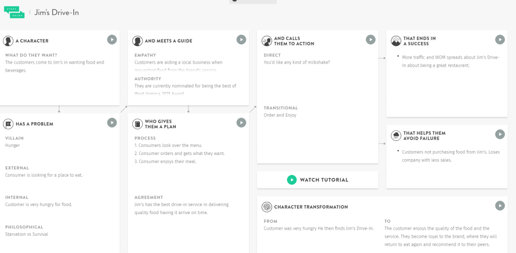 When looking at the steps that outline the brandscript model for Jim’s Drive-In, I had to understand the sensibilities of a small local business that serves food. The character is someone who is looking for food to eat. The customer’s problem is externally finding a place to eat while trying not to eat fast food. Internally, this character has some time on his hands to find a place to eat, but he is exhausted from eating the usual fast-food grub and is not looking to eat inside a restaurant, mainly from not wanting to spend too much time and money. I would consider Jims to not be swift like fastfood but faster than the typical sit-down restaurants. The villain is hunger, while the philosophical conflict is survival against starvation. I considered these to be the problems because obviously, customers are looking for a place to eat because they are hungry. While that is the case, there are many places to eat among Jim’s Drive-In, and it would be hard to tell if they would commit to ordering from the restaurant depending on how they want to use their time and money.